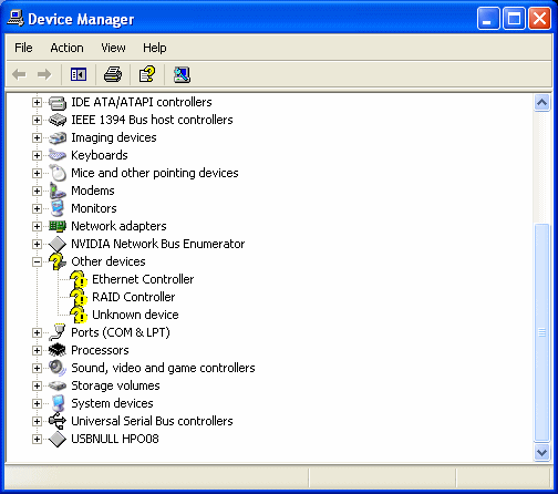 If you have any items that have yellow question marks (see Other devices above) with an exclaimation point on them, you have unidentified hardware for which drivers are not installed. You will need to obtain drivers from the hardware manufacturer.