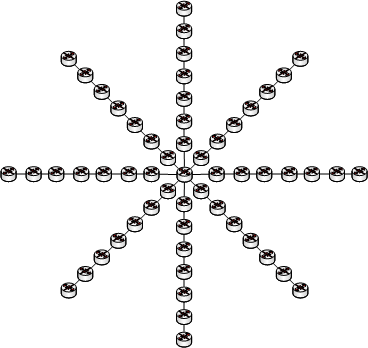 As you can see, there are 57 routers in this diagram. That’s a LOT more than 15 routers. Note that no router is more than 15 hops from any other router. If you continue along on this design, you could continue to add chains of 7 routers from the core router for as long as there are network ports available and grow this network larger still.