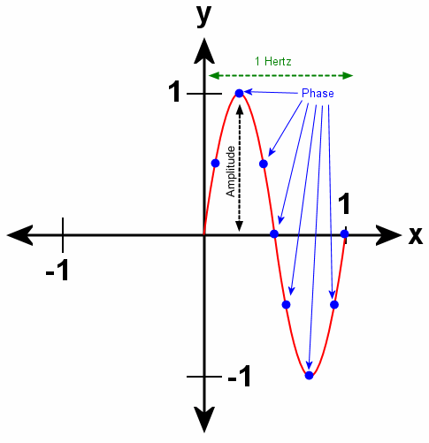 Below is a graph that illustrates a specific freqency at 1 hertz. It shows it's amplitude, its frequecy (1 hertz per second) and its phase value at several points in time between zero seconds and 1 second.