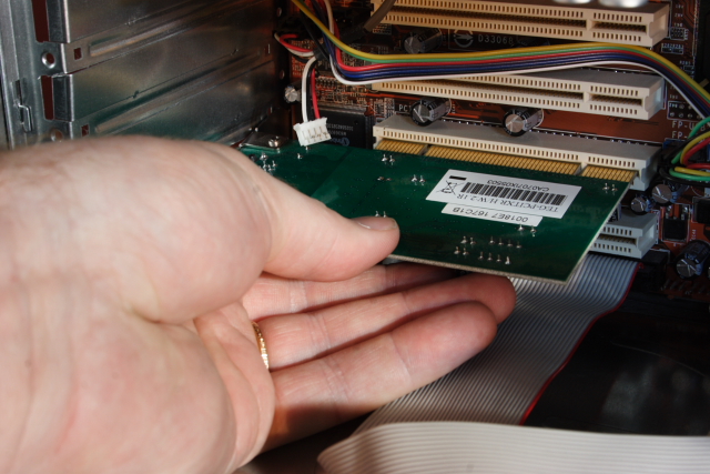 - Insert the Network Card into the slot in the mainboard. Cards can only be inserted one way because there is a plastic piece that matches a gap in the gold contacts. Press the card in firmly, but don't break the mainboard by pressing too hard.