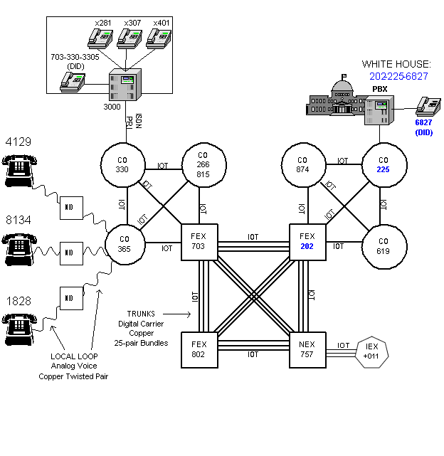 Click any part of the image below to read a brief tutorial on that component of the public switched telephone network.